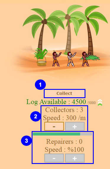 2. Используя кнопки + и - возможно добавление или удаление сборщиков с ресурса. Чем больше работников задействовано, тем больше ресурсов будет добыто за единицу времени.