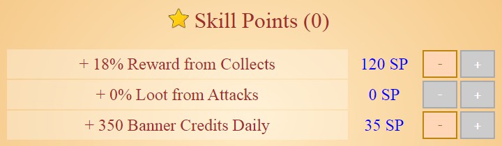 Skill Points - Очки навыков используются для увеличения возможностей вашего города. Вы получите 100 очков опыта за каждую сделку на рынке. У вас будет 1 очко навыков за каждые 1000 XP. Вы можете использовать свои очки навыка, чтобы увеличить свои награды, за сбор или добычу в результате атак или для получения других наград.